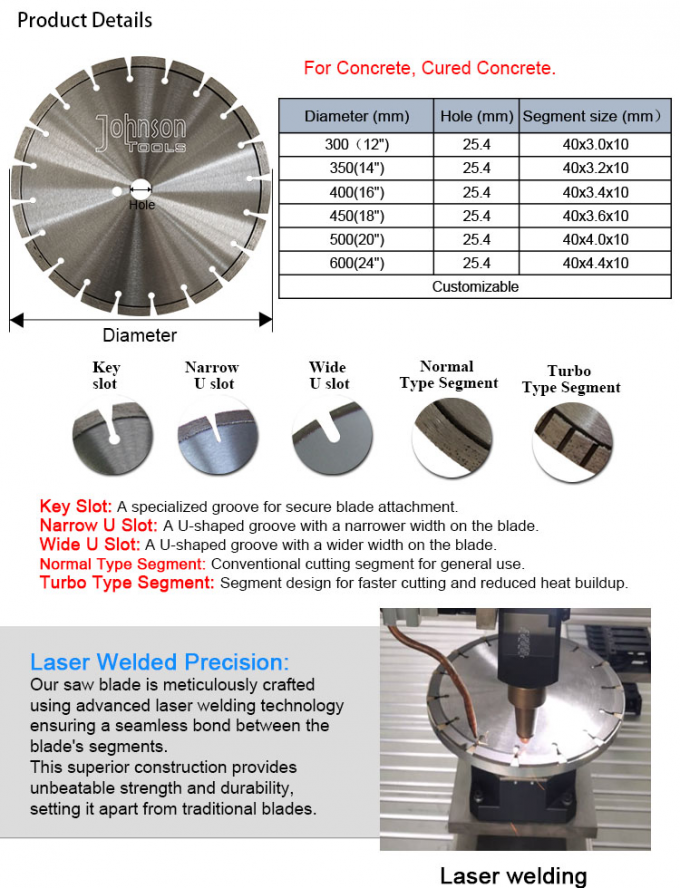 2. اطلاعات مشخصات تیغه اره توربو الماسه 500 میلی متری برای بتن عمل آوری شده با راندمان خوب